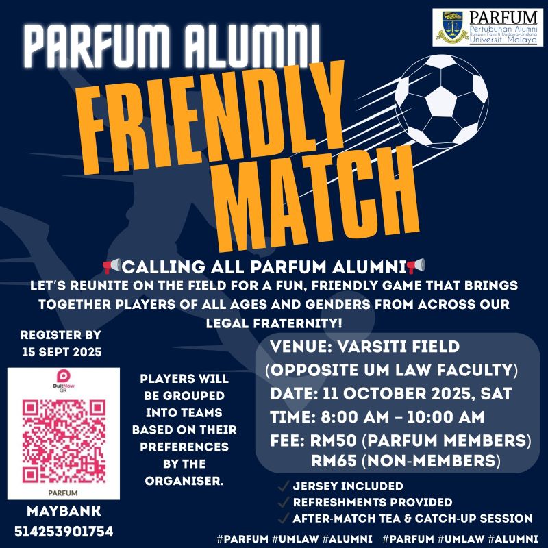 Ready to lace up your boots and reconnect with old friends? Join us for an exciting Alumni Friendly Match that brings together players of all ages and genders from across our legal fraternity. ๐ Venue: Varsity Field (opposite UM Law Faculty) ๐ Date: Saturday, 11 October 2025 โฐ Time: 8:00 AM – 10:00 AM ๐ฐ …